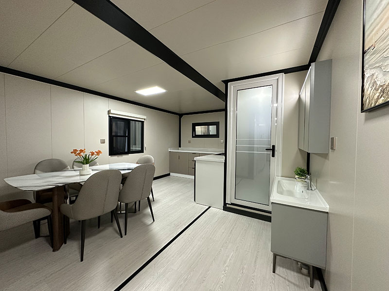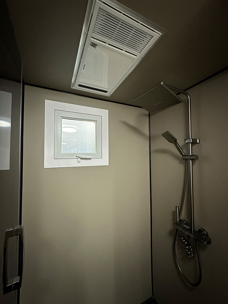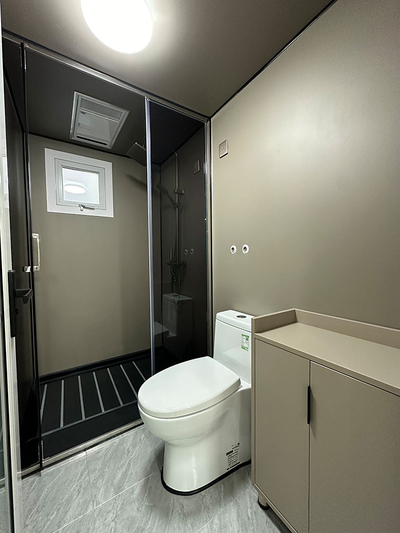 3.Internal facilities: shower (all copper core), brand wash basin, brand intelligent light-filling mirror cabinet, brand toilet, floor drain, water and sewerage pipes